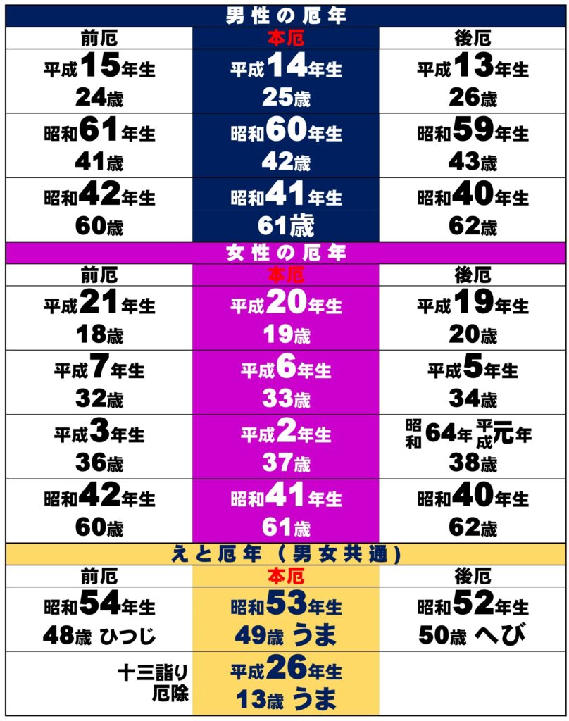 厄年とは、昔から「人生において災いが起こりやすい年」といわれており、現代では社会的にも心身的にも転換期であるといわれています。