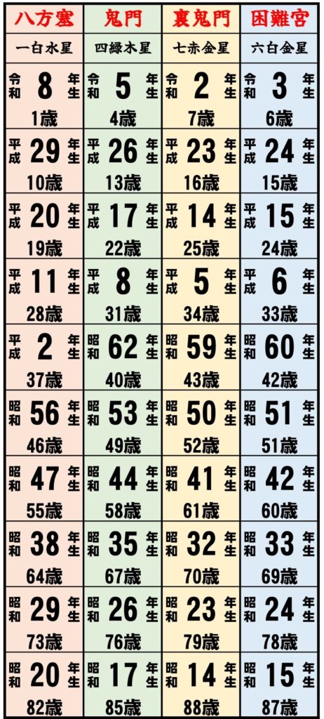 特に「八方塞・北門・鬼門・裏鬼門」は、いずれも一年間にわたり強い影響力をもち、予期せぬ災いを招くことがあります。