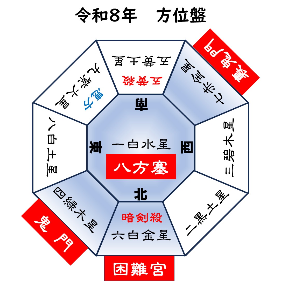文字通り八方が(全ての方角から)ふさがれており、どの方角に物事を進めても上手くいかない年とされております。
